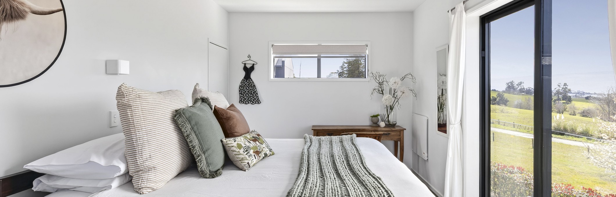 Our accommodation features three stylish, self-contained double units, all located on the top floor to maximise the views. Each unit sleeps two guests, making Tasman View perfect for couples or small groups of up to six seeking a peaceful getaway. Unwind with a picnic by the pond, wander through our 8.6 hectares of farmland, or simply relax in one of our outdoor spaces while soaking up the stunning views.