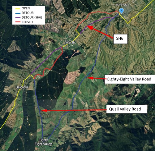 - (Blue route below - recommended) From Wakefield, follow Eighty Eight Valley Road and turn right onto Quail Valley Road until it joins the Great Taste Trail at State Highway 6. This option is using back roads with lower traffic volume and has signage showing the way. Please note there is no food or water options on this detour. The distance of this detour is 16km.