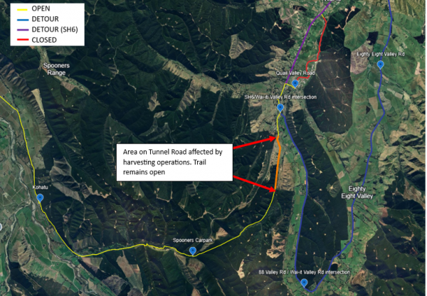 - (Blue route below - recommended) From Wakefield, follow Eighty Eight Valley Road to the end. Turn right onto Wai-iti Valley Road until it joins the Great Taste Trail at State Highway 6. This option is using back roads with lower traffic volume and has signage showing the way. Please note there is no food or water options on this detour. The distance of this detour is 23km.